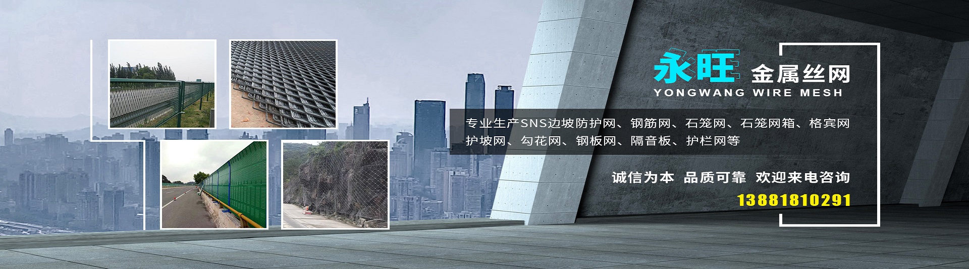 成都市永旺金屬絲網有限公司是一家研發、生產、加工、銷售為一體的責任制企業公司。本公司“以誠信為本、以服務社會已任、以科學創新為理念”。 專業生產SNS邊坡防護網、鋼筋網、石籠網、石籠網箱、格賓網、護坡網、勾花網、鋼板網、隔音板、護欄網等。產品主要運用于鐵路,高速公路,橋梁,隧道,機場,礦山,河道,球場,碼頭,港口等多個領域。 本公司期待與您長期合作,希望與您共創輝煌,我們愿與各業朋友精誠合作,共創美好未來,希望各業朋友來函來電